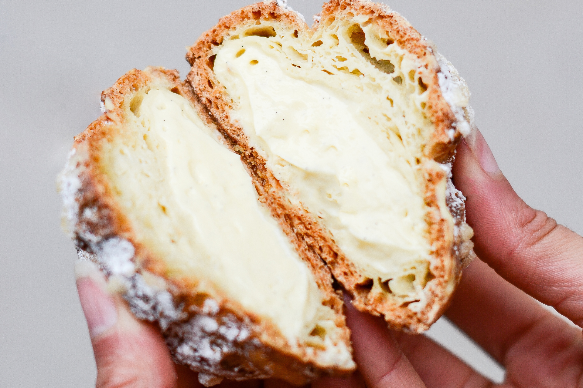 a Person holds a Cream Puff cut in half